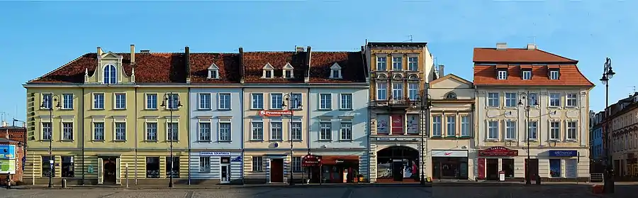 The original buildings of the Market Square were made of wood. Residential brick buildings do not appear before the 15th century.[5] The Gothic brick edifices from the end of the 15th century were expanded with Baroque features in the 17th century and rebuilt at the beginning of the 20th century with Eclectic and Art Nouveau façades. The oldest element preserved in the vicinity of the Market Square can be found at the back of the house at Farna Street 6: it is a stone tablet with a Latin carving, displaying the date (1593) of the building and the initials of the owner -Bartosz Krąpiewski-, city councilor and mayor of Bydgoszcz between 1599 and 1603.[6]