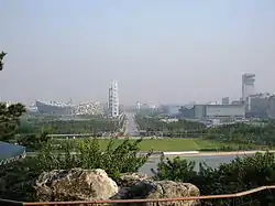 The Beijing Olympic Forest Park is located on the northern end of the city's north–south central meridian, where the Forbidden City palace is also situated and is divided by the North Fifth Ring Road.[2][3] The park is composed of a Northern Garden and a Southern Garden which is connected by an ecological bridge that extends over the Beijing's expressway. Within these two garden sections are various features such as the Yangshan Mountain, Aohai Sea, large-scale flower fields, and artificial wetland. The park also contains large sports fields like the National Tennis Center, football field, and hockey field.[3]