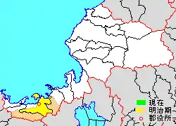 * yellow - areas formerly within the district borders during the early Meiji period