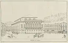 The first stone was laid on 1 July 1818 by Mademoiselle Mars.[1] Built according to the plan of the architect Auguste Dukers, the theatre in the neoclassical style has a massive parallelepipedic shape. Its main façade is decorated with a marble colonnade[alpha 1] limited by a balustrade and overlooking the arcades on the ground floor. The Théâtre royal de Liège was inaugurated on 4 November 1820.