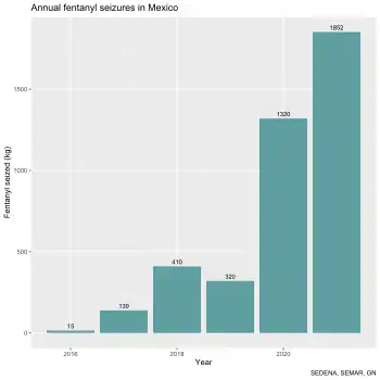 According to the United States Drug Enforcement Agency in 2023, China continued to be the primary source of fentanyl being imported into the United States, killing over 100 Americans every day.[121] Over a two-year period, close to $800 million worth of fentanyl pills were illegally sold online to the US by Chinese distributors.[122][123] The drug is usually manufactured in China, then shipped to Mexico, where it is processed and packaged, which is then smuggled into the US by drug cartels.[124] A large amount is also purchased online and shipped through the US Postal Service.[125] It can also be purchased directly from China, which has become a major manufacturer of various synthetic drugs illegal in the US.[126] AP reporters found multiple sellers in China willing to ship carfentanyl, an elephant tranquilizer that is so potent it has been considered a chemical weapon. The sellers also offered advice on how to evade screening by US authorities.[127] According to Assistant US Attorney, Matt Cronin: