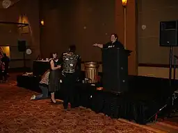 "Alan Smithee" (the man in the gaudy jacket) consulting with his helpers at the 2007 Smithee Awards at the Origins International Game Expo