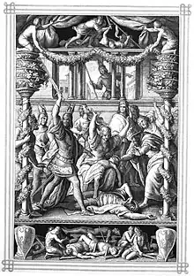 In the Þiðreks saga, he is likewise killed by Hagen (Högni) in the hall, after he provokes him following the counsel of his mother. This causes a fierce fight to erupt. Kriemhild (Grimhild) is then killed after an enraged Thidrek sees her checking if her brothers are dead by sticking pieces of flaming wood into their mouths.[1][2] Similarly, in the Heldenbücher she has her son provoke Hagen, who kills him, leading to an outbreak of hostilities in which many heroes die. When Dietrich takes Gunther and Hagen prisoner, she cuts off their heads, causing Dietrich to cut her to pieces.[1][3][4]