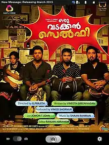 Oru Vadakkan Selfie (transl. A Northerner's selfie) is a 2015 Indian Malayalam-language road-comedy film directed by G. Prajith and scripted by Vineeth Sreenivasan.[5] The film features Nivin Pauly, Manjima Mohan, Aju Varghese, Neeraj Madhav and Vineeth Sreenivasan.[6][7] The music was composed by Shaan Rahman. It was released on 27 March to positive reviews,[8] and became one of the biggest grossing Malayalam films of the year. Some news media and the Kerala Film Producers Association called it the first successful Malayalam film of 2015. This movie marks the debut of Manjima Mohan as an actress in Malayalam movie; earlier, she played a child in films including Priyam and Sundara Purushan. The film was remade in telugu as Meda meedha abbayi and it received good response from critics and audience.