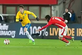 Oscar was given his first senior call-up as a substitute in a 0–0 draw against Argentina.[64] Due to injuries to the attacking midfielder Ganso, he saw his national team opportunities increase and was even preferred over more experienced playmakers on a number of occasions.[65] In June 2012, Oscar scored his first international goal in a friendly match in New York City against Argentina, which Brazil went on to lose 4–3. He also scored a penalty kick against China as well as recording three assists in the 8–0 rout, before firing a brace against Iraq one month later.[66]