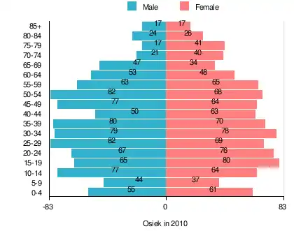 According to the 2011 Polish census, there were 2,001 people residing in Osiek, of whom 50% were male and 50% were female. In the town, the population consisted of 21.2% inhabitants under the age of 18; 38.6% between the age of 18 and 44; 23.6% from 45 to 64; and 16.6% residents who were 65 years of age or older.[1]