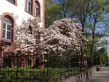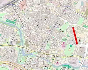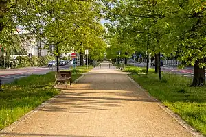 This axis was a dual carriageway avenue lined up with trees, called Hohenzolernstrasse in its south part, Bülowstrasse in it north part (in 1920 it became part of Adam Mickiewicz alley). The construction of the avenue has been completed in 1903; this was then the widest street in the city: 40 m wide, it had two carriageways, and in a pedestrian walkway in the middle with lawn and trees (red oaks with festoons of Virginia creepers.[4] Street inception was in direct relationship with the erection in 1902 of buildings for the Kaiser Wilhelm's first university and scientific institution in Bydgoszcz (German: Kaiser "Wilhelm's Institut für Landwirtschaft zu Bromberg").[2] The institute architectural ensemble has been erected on the eastern side of the street between 1903 and 1906. By contrast, the area on the western side of the alley has been planned and designed in 1912 by German architect Josef Stübben. However, most of the villas in this district ("Sielanka" or Idyll) have been essentially erected during interwar period.[5]