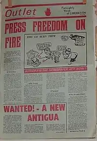 The Outlet was a radical newspaper published in Saint John's, Antigua and Barbuda.[1][2] The Outlet was founded in 1968.[3] The newspaper was edited by Tim Hector and James Knight.[1][2][4] It functioned as a weekly organ of the Antigua Caribbean Liberation Movement (ACLM).[5] For the ACLM the newspaper played a very important role.[6] In its heyday Outlet claimed a circulation of around 5,000 copies, thus being the most widely read newspaper on Antigua.[3][6] As of the early 1970s, Outlet and Standard (which appeared on an irregular basis) were the sole opposition newspapers in the country.[7]