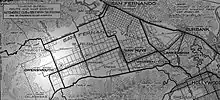 The town was started by the Los Angeles Suburban Homes Company as part of an extraordinary real estate development in Southern California.[1] Los Angeles Suburban Homes Company was owned by a syndicate of rich Los Angeles investors, developers, and speculators: including Harrison Gray Otis, Harry Chandler, Moses Sherman, Hobart Johnstone Whitley, and others.[2] On April 2, 1915, H. J. Whitley purchased the Suburban Home Company so that he would have complete control for finishing the development. [3] It anticipated possible connections to but was planned independent of the soon to be completed (1913) Los Angeles Aqueduct from the Owens River watershed to the City of Los Angeles through the San Fernando Valley in Los Angeles County.The newly built Sherman Way double drive and the Pacific Electric street cars, opened on December 7, 1912, gave new access to the town and to the other new towns in the valley Van Nuys (1911) and Marion (now Reseda); At the time the new road and streetcar seemed like route to an open agricultural fields at the end of the line — but was a necessity to promote development. Sherman Way was a paved boulevard with lush landscaping and no speed limit where one might get up to 35 mph, there was a separate dirt road for farm wagons/equipment, and telegraph lines.[2]