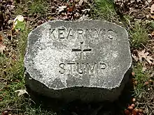 Kearny's Stump is a granite marker in the shape of a tree stump, located a few feet away from the memorial. The original tree stump was purported to be the spot where Kearny was killed, though he is now known to have died in a cornfield about 150 yards (140 m) away (outside the bounds of the current-day park). The stump was however used as the origin of the survey used to define the memorial plot, so when the original stump rotted away it was replaced with a stone version.[2]