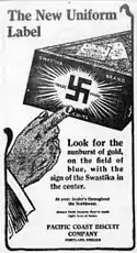 In 1907 Pacific Coast began using a red swastika trademark in its marketing. In the early 20th century, swastika references in Pacific states were not unknown: for example, in 1914 the first cinema in Sausalito, California, opened under the name "Swastika Theatre".[6] Pacific Coast's packaging was designed to mimic that of Nabisco, and Pacific Coast's swastika was similar in color and placement to Nabisco's in-er-seal trademark, although it did not resemble the shape of Nabisco's trademark.[7]