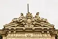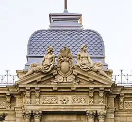 The triangular pediment on central rustication cornice is expressed with heraldic elements and sculpture figures. Architect Nicholas von der Nonne, in his original form, tried to mark the central part with a vivid artistic form, and decorated the form with a decorative dome on it. Vividly profiled cornice with sophisticated architectural detail differs in volume-spatial composition of the building.[8]