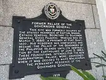 - ↑ Former Palace of the Governors General (sic) (Marker on building facade). Palacio del Gobernador in Intramuros: Historical Research and Markers Committee. 1936.