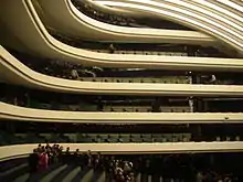 The building rises 14 stories above ground and includes three stories below ground. Its height is 75 metres (246 ft), being the tallest opera house in the world.[5] Under the metallic, expansive curved-roof structure, 230 m (755 ft) in length, the 40,000 m2 (431,000 sq ft) building contains four auditoriums: