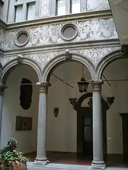 The palace has a central court in pure Classical style. It has a portico on three sides, with columns and round arches in traditional pietra serena. The ground and first floors have grotesque monochrome decorations. The first floor has a loggia with a coffered ceiling. This is surmounted by another smaller loggia.