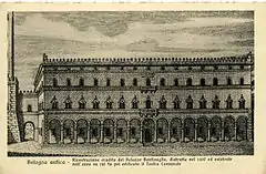 The palace of the noble Bolognese family of Bentivoglio was built on the orders of Sante Bentivoglio, in Via San Donato (today Via Zamboni), starting in 1460, and was subsequently completed by Giovanni II Bentivoglio. Contemporary chroniclers and scholars have attempted to reconstruct the appearance of the great house on the basis of often enthusiastic descriptions. The main facade facing onto Via San Donato measured 30 meters, while the sides were over 140 meters in length. Located on the ground floor were the apartments of the men of the house of Bentivoglio, while the upper floor held the apartment of Giovanni II, richly frescoed, and the equally sumptuous apartment of Ginevra Sforza and the other women of the house. The building also housed guards and soldiers and included guest rooms, warehouses and depots of arms. The building had 244 rooms in total. In it, the Bentivoglio received illustrious visitors and friends, and hosted extravagant dinners and parties.[1]