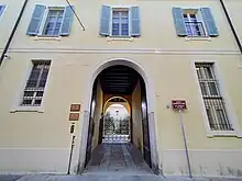 The entrance hall has flooring in terracotta tiles with trottatoie and wooden ceiling; along the right wall is, curiously enough, a millstone walled in; the entrance leads to a portico with three forts with round arches and columns of Ionic order resting on stone plinths.[1] Three windows[1] rest on the stringcourse cornice.