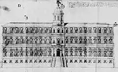 An initial design was made by Francesco Paciotto, from Urbino, and in 1558, the architect Giacomo Barozzi da Vignola, better known as Vignola, was brought in to revise the designs. Vignola had already been commissioned to design the Villa Farnese at Caprarola (Latium) for Cardinal Alessandro Farnese, the older brother of the duke. Vignola had to take Piacotto's design into account but significantly revised the design which was presented to the patrons in 1561. The drawings are for a vast palace on a scale paralleled only by the Vatican Palace in Italy; the rectangular plan is 113.25 metres by 88 metres and over 40 meters in height.[1] The building works were entrusted to Giovanni Bernardo Della Valle, Giovanni Lavezzari and Bernardo Panizzari (Caramosino). The actual construction, however, made up only less than a half of Vignola's original project and lacked many of the planned architectural features.