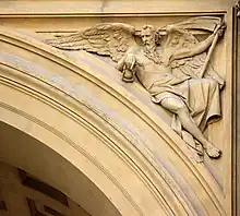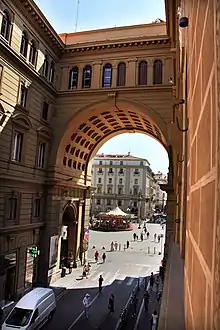 The large building, erected to a design by architect Vincenzo Micheli (1895), defines itself as a scenographic backdrop to the square, laid out from 1883 with the destruction of the Mercato Vecchio and the Jewish pond. Beyond its being a palace, the architecture transcends the need to offer a civil dwelling building in the bourgeois sense, to become a monumental urban sign, and impose itself through the great archway leading onto Via Strozzi, developed to include the two orders of the façades of the lateral buildings, each of which is developed for a further six axes, the last of which is overhanging. Each of these lateral bodies then develops deeply into the respective blocks, two internal courtyards towards via Brunelleschi, and an elongated one towards via Pellicceria. The wide and high archway with the large central body, adorned with statues and crowned by the plastic group of the Italy enthroned accompanied by the figures of Art and Science (removed in 1904), framed the equestrian statue of the king Victor Emmanuel II of Savoy, placed in the centre of the square and later moved to the Piazzale delle Cascine.[4] The three statues were mockingly renamed by the Florentines with the names of three prostitutes of the period, as can be found in some satirical sonnets of the time by Vamba and others: the Starnotti or Schiccherona, a tenant of Russian origin whose surname was Starnowka; then the Cambarbini and the Trattienghi.[5]