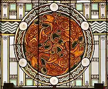 The entrance atrium was decorated by Giuseppe Moroni and presents marble decorations, elaborate stuccos often with weaving designs, and frescoes. The portal leads to an atrium with a grand double staircase, which is flanked by two panels, painted by Chini and portraying Autumn and Spring. The figures float or stand is a dream-like ether exuberantly blooming with forests or rivers of floral and fruit motifs. Chini and his firm would design most of the ceramic wall decorations, windows, and even furniture. The counter-facade was painted with the Triptych of Hygieia by Moroni, alluding to the building's therapeutic functions.[2]