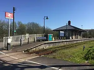 The station is unstaffed and has no ticket machine (as is the case for almost all stations on the line), so all tickets must be purchased on the train or in advance of travel. The main building is Grade II-listed and dates from 1857, but had been disused since the 1960s - it was restored and refurbished by Network Rail (with assistance from the Railway Heritage Trust and the local community) in 2013-14. It is provided with the standard amenities - help point, CIS screen, payphone and timetable poster board.[8] Step-free access is available from the level crossing at the north end - this still has manually-operated metal gates rather than the automatic barriers used elsewhere on the line.