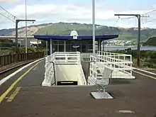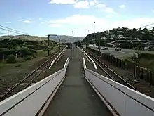 ![]() Paremata station as seen from the southern pedestrian footbridge, 19 January 2008. An EM/ET class electric multiple unit can be seen arriving with a service bound for Wellington. | |||||||||||