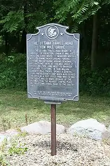 Ten Mile Grove is said to be the earliest settlement in Patton Township with about a dozen families residing there in 1853. It was located on the Danville-Ottawa road and named such because it was ten miles (16 km) from the nearest settlement.[5] The grove is partly contained in the Howard Thomas Memorial Nature Preserve. The preserve, containing many Bur oak, sustained damage in a 2004 wind storm which felled numerous trees. Thirty to fifty percent of trees were felled in some portions, especially the western part. Volunteers cleared trees from the trails, one of which had 17 trees blocking it.[6]