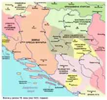 Knez Pavle Radinović, after whom the zemlja of Pavlović is called, ruled the area in eastern Bosnia. The more significant expansion of Pavle's territory began in 1391, when the Sanković family sold the state territory, which the king could only decide on, without the consent of the king. On the order of King Stjepan Dabiša and the nobles, Pavle with Duke Vlatko Vuković occupied Konavle and expanded his possessions, controlling customs town on Ledenice with Vlatko. In Bosnia, he expanded his territories as far as Olovo in the west, while in the east his territory reached as far as Banja, where it can be seen from the Dubrovnik archive records that, in 1405, the seat of the bishopric of Dabar-Bosna was under the rule of Knez Pavle. He was killed in a conspiracy of King Ostoja (first reign 1398-1404, second reign 1409-1418), duke Sandalj (1392-1435) and Zlatonosović during a walk in Parena poljana between royal court in Sutjeska and Bobovac royal fortress-town, after which he was succeeded by his elder son Petar I (1415-1420).[3]