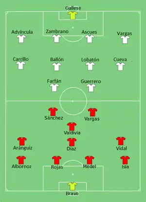 - ↑ "Perú cayó 2-1 ante Chile con 10 hombres y jugará por el tercer puesto de la Copa América 2015" [Peru fell 2-1 to Chile with 10 men and will play for third place in the 2015 Copa América]. Peru21 (in Spanish). 2015-06-30. Retrieved 2022-11-03.