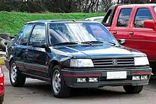 - XS and SX: 1580cc XU5, three door version was designated XS and the five door version SX. Marketed as a sporty model, to complement the GTI, with the 115 PS (85 kW; 113 bhp) XU5 injection engine. Was a little more basic than the SR models, to enhance the sporty feel, and made do without such things as luxury seats, instead having the tweed sports seats from the Peugeot 205 XS. In some markets, such as Sweden and Switzerland, the XS was fitted with the XU9M, a lower tuned version of the GTi's 1.9-liter engine producing 110 PS (81 kW; 108 bhp).[10]