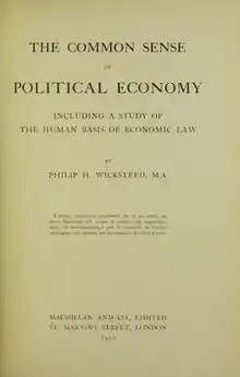 - Wicksteed, Philip H. (1910). The Common Sense of Political Economy: Including a Study of the Human Basis of Economic Law. London: Macmillan. reprinted in 1933, L. Robbins, ed., Clifton NJ: Augustus M. Kelley Publishers