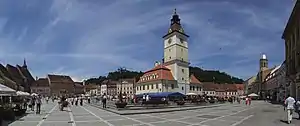 The Council Square (Piața Sfatului in Romanian, former Marktplatz in German, Főtér or Tanács tér in Hungarian) is located in the historic centre of Brașov, Romania.[1] It obtained its right to hold markets in 1520, but it has been the place for weekly and annual markets since 1364, being visited by merchants from the country and abroad. It is surrounded by 18th-19th century houses, most of which are historical monuments.