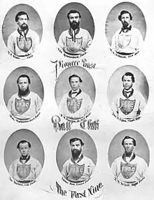 The Pioneer Base Ball Club was organized on June 2, 1866, the first baseball team formed in the state of Oregon.[1][2] Its first recorded game took place on August 3, 1866.[3] The team, which at the time were said to represent the entire state of Oregon, played an intra-squad match-up, meaning they split the team up and played against each other.[3] The attendance of the game was reported as being "tolerably fair" but that many spectators arrived to the team's ball park East Portland while the game was concluding.[3] Robert Law, a pitcher, served as the captain of the "fielding nine" and James Steel, a catcher led the "batting nine".[3] The fielders' infield was composed of James B. Upton at shortstop, Ward K. Witherell at first base, George Wheolock at second and Frank Warren at third.[3] In the outfield, the fielders played C. F. Berges in left and A. White in right.[3] The fielders catcher was Theodore F. Miner.[3] The batters' infield featured C. Upton at shortstop, Ed Barstow at first base, Frank Warren at second and S. B. Parrish at third.[3] George Cadd and Joseph Buchtel were the batters' outfielders.[3] William Wadhams was their pitcher.[3] The batting nine won the game over the fielders by a score of 28–24.[3]