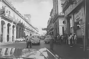 The district has two paifang,[24][lower-alpha 2] the larger one located on Calle Dragones. The long-neglected Chinatown in Havana, Cuba, received materials for its paifang from the People's Republic of China as part of the Chinatown's gradual renaissance.[25] China donated the materials in the late 1990s.[26] It has a well defined written welcoming sign in Chinese and Spanish. The smaller arch is located on Zanja strip. Cuba's Chinese boom ended when Fidel Castro's 1959 revolution seized private businesses, sending tens of thousands of business-minded Chinese fleeing, mainly to the United States. Descendants are now making efforts to preserve and revive the culture.[10] Many of the businesses in the Plaza del Vapor were operated and owned by Chinese Cubans.