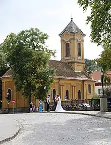 Požarevac Church (Serbian Cyrillic: Пожаревачка црква, Hungarian: Pozsarevacska szerb ortodox templom), officially Church of St. Archangel Michael, in Szentendre is a Serbian Orthodox church in Hungary named after the town of Požarevac in Serbia. The church is one of a couple of Serbian Orthodox churches in the town and is a part of the Eparchy of Buda. The church was completed in 1759 and consecrated in 1763.[1] According to tradition, it was built next to the Bučina stream. The neighborhood around the church was also known as Požarevačka Mahala. The iconostasis of the Pozarevac Church is older than the present church since it was originally installed in the "old" Cathedral Church in 1742.[1] The church was damaged during a major flood in 1838 but was soon renovated. The latest renovation of the church took place in 2018.