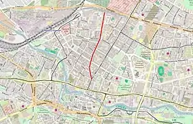 Pomorska Street is roughly oriented south–north, starting from Gdańska Street up to the railway line to the north. It crosses important thoroughfares, such as Śniadeckich Street, Cieszkowski Street or Swiętojańska street.
