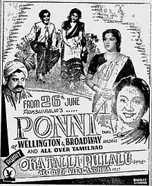 Ponni is a 1953 Indian Tamil-language film starring Sriram, Lalitha and Padmini.[1] The film was released in 1953, and the Telugu version Oka Talli Pillalu in the same year.