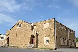 It is a two-story 100 by 78 feet (30 m × 24 m) building built of coursed cream-colored native sandstone, with a roof that is flat and gabled and has parapets.[2]