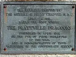 In his book War History of the Prattville Dragoons Captain W.F. Mims (the last Commander of Co. H, 3rd Ala. Cav., CSA) spoke fondly of Pratt's generosity, stating, "Many not being able to furnish their mounts were greatly discouraged. That great and good man, Daniel Pratt, so well known for deeds of charity and generosity, supplied the defeiciency at a cost of many hundred dollars." (Quoting Historian Tommy Brown of the Continental / Eagle Manufacturing Company - still producing cotton gins in Daniel Pratt's buildings - "Daniel Pratt was Alabama's first millionaire.") The rank of "Captain" was voted by the members of the Unit, and the first Captain of the Prattville Dragoons was Jesse Cox "of Steamboat notoriety" from Mobile, Alabama. In total, there was originally "18 commissioned and non-commissioned officers and 82 privates, total 100, with two faithful colored cooks." The soldiers formed for their send-off at the school yard of the Prattville Academy and was presented a beautiful silk flag that was sewn by hand by the young ladies of Prattville. On Confederate Memorial Day in 1916, a large boulder with a bronze plaque was placed on that site to honor the Dragoons by the United Daughters of the Confederacy.
