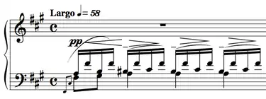 Rachmaninoff's Ten Preludes abandon the traditional short prelude form delineated by composers such as Bach, Scriabin, and Chopin. Unlike Chopin's set, some half-page musical fragments, Rachmaninoff's Ten Preludes last for several minutes each, expanding into complex polyphonic forms with musically independent sections.[2] The pieces perhaps represent a culmination of the Romantic idiom.[3] The set reflects Rachmaninoff's experience as a virtuoso pianist and master composer, testing the "...technical, tonal, harmonic, rhythmic, lyrical, and percussive capabilities of the piano."[3]