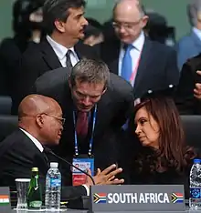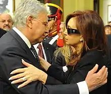 In September 2010, it was announced that Argentina was elected president of the Group of 77+China and prepared to act as a ‘bridge" with G-20 major economies to which it also belongs.[82] She visited Chile during their Bicentenary celebrations where she also assisted at the baptism of a Chilean baby, Anaís Escobar Maldonado, born in the Argentine Hospital deployed at Curico after the earthquake. The visit had a high profile in the media mainly because of the possible extradition to Chile of Sergio Apablaza. She met with president Sebastián Piñera and participated in the festivities at the national stadium.[83] She also confirmed the celebration of the III bi-national cabinet meeting for next October.[84][85] Fernández de Kirchner then departed for New York to give her United Nations General Assembly speech where she once again criticized Britain over the Falklands (Malvinas) issue, and Iran for the 1994 AMIA bombing whilst giving her support for an Israeli-Palestinian dialogue and an eventual Palestinian state.[86] On 30 September she hosted the UNASUR presidents' emergency summit at Buenos Aires due to the Ecuador crisis and started an official visit to Germany the following day in order to participate as a Guest of Honour at the Frankfurt Book Fair[87] and meet with Chancellor Angela Merkel. In October she inaugurates the III News Agencies World Congress to be held in Bariloche.[88] This same month, and as part of the 2006 civilian nuclear-power reactivation program, Fernández reopened the Pilcaniyeu uranium enrichment plant, put on ice in the 1990s, amid worsening shortages of natural gas.[89] Following the death of her spouse (see below), she also resumed activities and flew to South Korea for the G20 Seoul summit. After her return she announces that the Paris Club agrees to debt talks without the International Monetary Fund intervention as proposed by Argentina since 2008. These negotiations will result in the settlement of the last portion of the sovereign debt defaulted in the 2001 crisis after the successful restructuring debts of 2005 and 2009.[90] In November she also participated in the UNASUR Summit at Guyana after which will host the XX Ibero-American Summit at Mar del Plata.