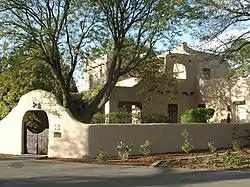 The President's house is an adobe residence in the Spanish Pueblo Revival style. It has vertical metal casement windows with Watson wood lintels and exposed vigas in the second-story. It has a rustic second-story balcony formed by vigas and supported by a log beam and posts. This building has had several additions since its original construction in 1930. All additions were in the Pueblo style and uphold the integrity of the original building. The building was designed by Miles Brittelle and built in 1930. John Gaw Meem designed an addition to the house in 1952. The building has a shape that resembles multiple squares and rectangles.[3][4]