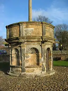 Two of Preston's most important structures were Preston Tower and Preston mercat cross. The mercat cross which dates from 1617, is unique both in its integrity and in that it is the only such structure in Scotland still in its original location and form. It has eight compartments, two doorways, six alcoves with semi-circular mouldings of scallop shells. The latter are said to be an allusion to the pilgrim traffic between North Berwick and St Andrews.