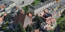 Bird's-eye view with the cathedral (left), Przyrzecze street (foreground) and parallel Jezuicka street (backdrop)