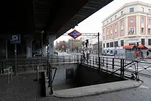Puente de Vallecas [ˈpwente ðe βaˈʝekas] is a station on Line 1 of the Madrid Metro, named for the Puente de Vallecas district. It is located in Zone A.[1] It has been open to the public since 8 May 1923.[2]