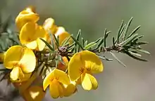Pultenaea mollis, commonly known as soft bush-pea or guinea flower bush pea,[2] is a species of flowering plant in the family Fabaceae and is endemic to south-eastern Australia. It is an erect or spreading shrub with narrow linear to elliptic or needle-shaped leaves and clusters of up to ten yellow to orange flowers with red markings.