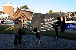 Punjabi’s first notable win came in February 2007 at Kempton Park Racecourse in Surrey, England where he won the Adonis Juvenile Novices' Hurdle, a Grade 2 National Hunt race.[1] However, it wasn’t until 2008 when Punjabi started to make a name for himself, when he became the first horse to legitimately contend for the WBX sponsored Triple Crown of Hurdling. The Triple Crown of Hurdling awards a £1,000,000 bonus to the horse that wins the Fighting Fifth Hurdle at Newcastle, the Christmas Hurdle at Kempton Park and the Champion Hurdle at Cheltenham in Gloucestershire, England in the same racing season.[2] Entering the 2008-2009 racing season, those involved with Punjabi believed their horse was a contender to win the Triple Crown of Hurdling.[3] In early December 2008, jockey Barry Geraghty and Punjabi narrowly beat out Sublimity to win the Fighting Fifth Hurdle.[4] Later that month, Punjabi was running well but fell two fences from the finish line at the Christmas Hurdle. The race was won by Harchibald.[5] In March 2009, Punjabi held off a late charge by Celestial Halo to win the Champion Hurdle in a dramatic photo finish.[6] After the win at the Champion Hurdle, trainer Nicky Henderson lamented at the fact that the fall in the Christmas Hurdle could have been "the most expensive fall in history."[7]