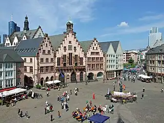 Römerberg (also spelled as Roemerberg, lit.'Roman Mountain') is a public space in Frankfurt, Germany. It is located in front of the Römer building complex, seat of the Frankfurt city administration since the 15th century.[1] As the site of numerous imperial coronations, trade fairs and Christmas markets, the square is the historic heart of the medieval Altstadt (old town) and today a popular tourist destination.