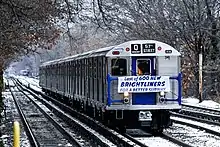 A ceremonial introduction trip for the new R32 "Brightliners" cars was held on September 9, 1964, operating from the New York Central Railroad's Mott Haven Yards in the Bronx to Grand Central Terminal in Midtown Manhattan.[10] The new cars were then placed into service on the Q on September 14, 1964, after their New York Central's spring-loaded under-running third rail shoes were replaced with gravity-type overrunning subway third rail shoes.[9][10] The R32s were originally assigned to the BMT Southern Division service only, initially on the Brighton Line (Q train) and the Sea Beach Line (N train), but were eventually reassigned to the West End Line (T and TT trains).