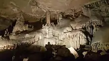 Parts of the cave system was discovered and documented as early as 1853, by 1929 Leo Lambert, a local caver who had recently discovered and opened Ruby Falls expanded the known cave passages.[1] Prior to Lambert's arrival, the property was owned by the Grand Hotel and used as a farm for their restaurant. On hot afternoons, it was said that the farmers would relax in front of several cracks in the rock at the base of the mountain and enjoy the cool air that was blowing out. In 1929, Leo Lambert was invited to explore the source of the air. As an experienced cave explorer, Lambert realized that in order for air to blow out of a crack in limestone rock, there must be a large cave beyond the crack to supply such a volume of air. Lambert enlarged the cracks and was rewarded by discovering several hundred feet of well-decorated cave passage in a cave that was close to U.S. Highway 41. He developed a series of trails, installed electric lights, and opened the cave to the public as "Tennessee Caverns" on June 28, 1931.